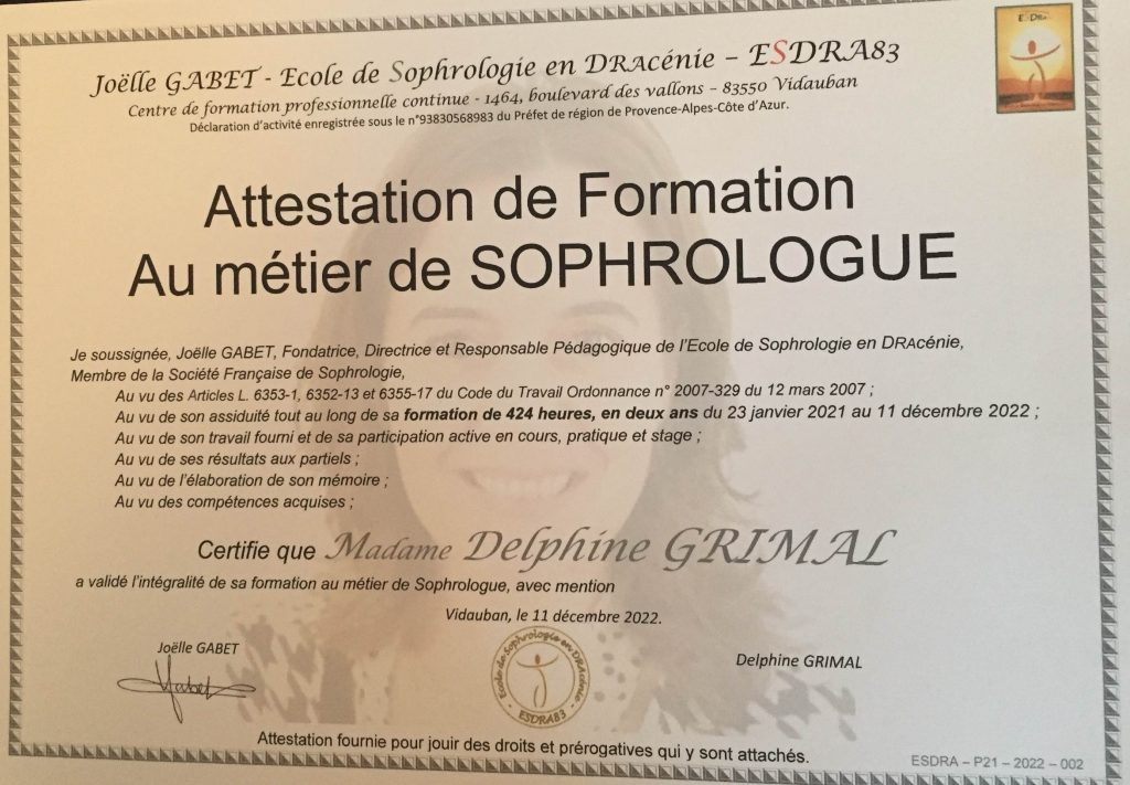 Diplôme de Sophrologue – Delphine GRIMAL – ESDRA83 – 11 décembre 2022
